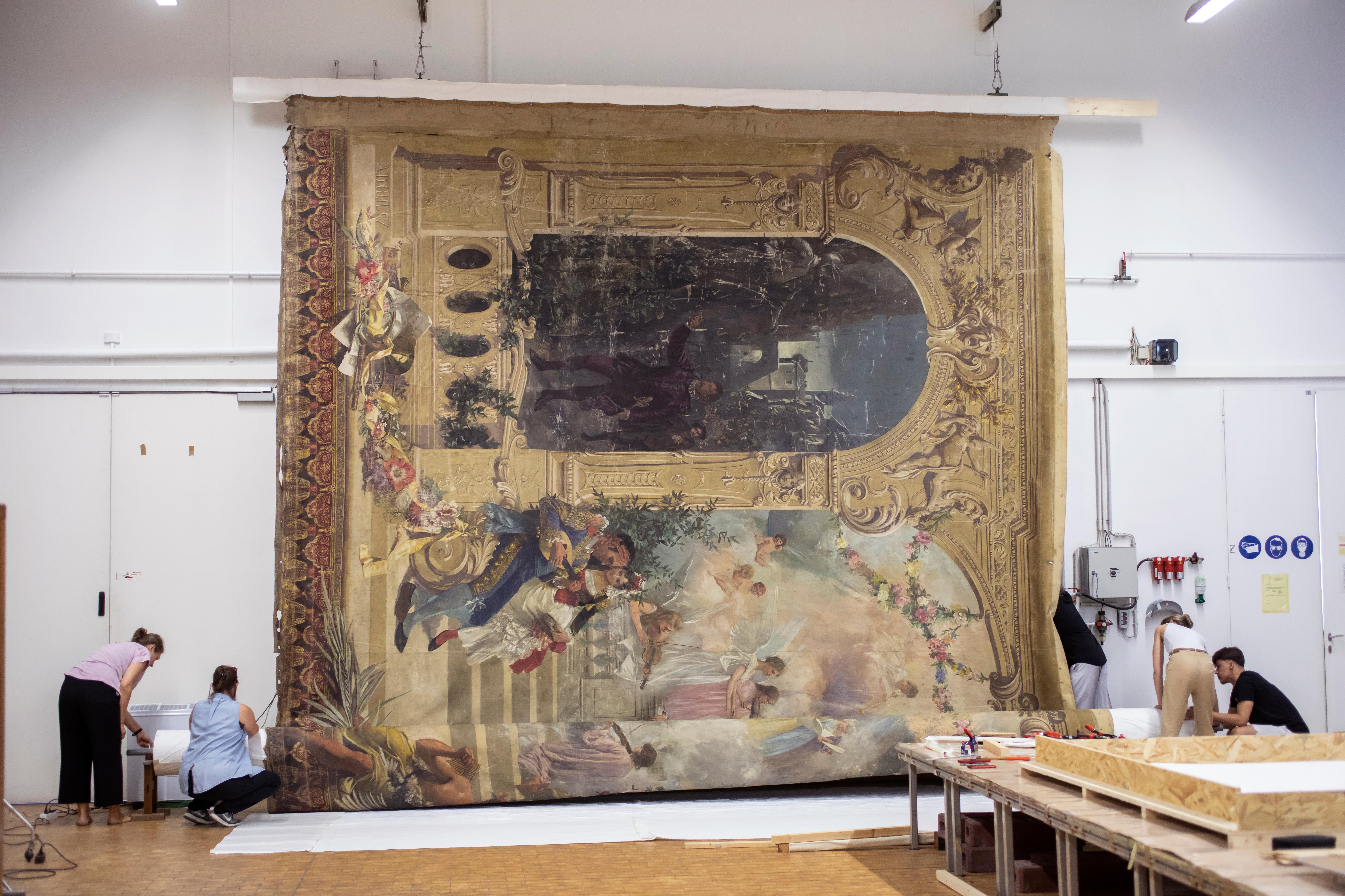 Aufgrund erheblicher Schäden wurde der Mozartvorhang bereits vor Jahrzehnten abgenommen und in einem Depot eingelagert, wo er im Laufe der Jahre zunehmend in Vergessenheit geriet. Heute zeigt sich das Werk in stark geschädigtem Zustand: Der Bildträger weist zahlreiche Risse und Löcher auf. Einige der Risse wurden vernäht oder hinterklebt, doch auch diese Reparaturen sind mittlerweile deutlich sichtbar und wirken störend auf das Gesamtbild. Durch das Rollen des Vorhanges bildeten sich Falten, an deren Kanten sich die Malschicht ablöst. Zudem kam die wasserlösliche Farbschicht an einigen Stellen während der Lagerung mit Feuchtigkeit in Kontakt, was sich heute in Form von Wasserflecken zeigt.